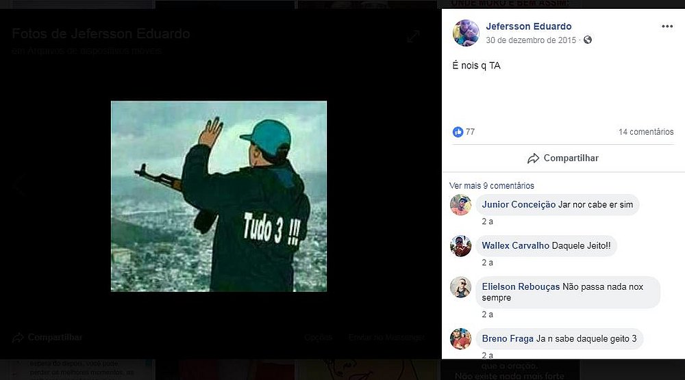 No perfil de Jeferson no Facebook, porém, uma publicação de dois anos atrás faz menção ao símbolo da facção Bonde do Maluco (BDM). Na postagem, um homem carregado uma arma faz o número 3 com as mãos e tem os dizeres ‘Tudo 3!!!’ (sic) escrita em suas costas – os dois gestos são considerados símbolos da facção.