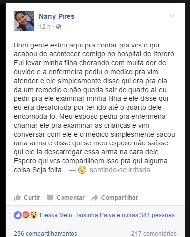 Por telefone, Gleidson Pereira, diretor-presidente da Associação dos Funcionários da unidade de saúde, o médico disse que se estressou com o pai da paciente e que estava trabalhando armado por conta da violência na cidade. Ainda conforme Gleidson, o profissional negou a acusação de falta de atendimento à criança. O hospital e a Associação de Funcionários informaram que apuram o caso.