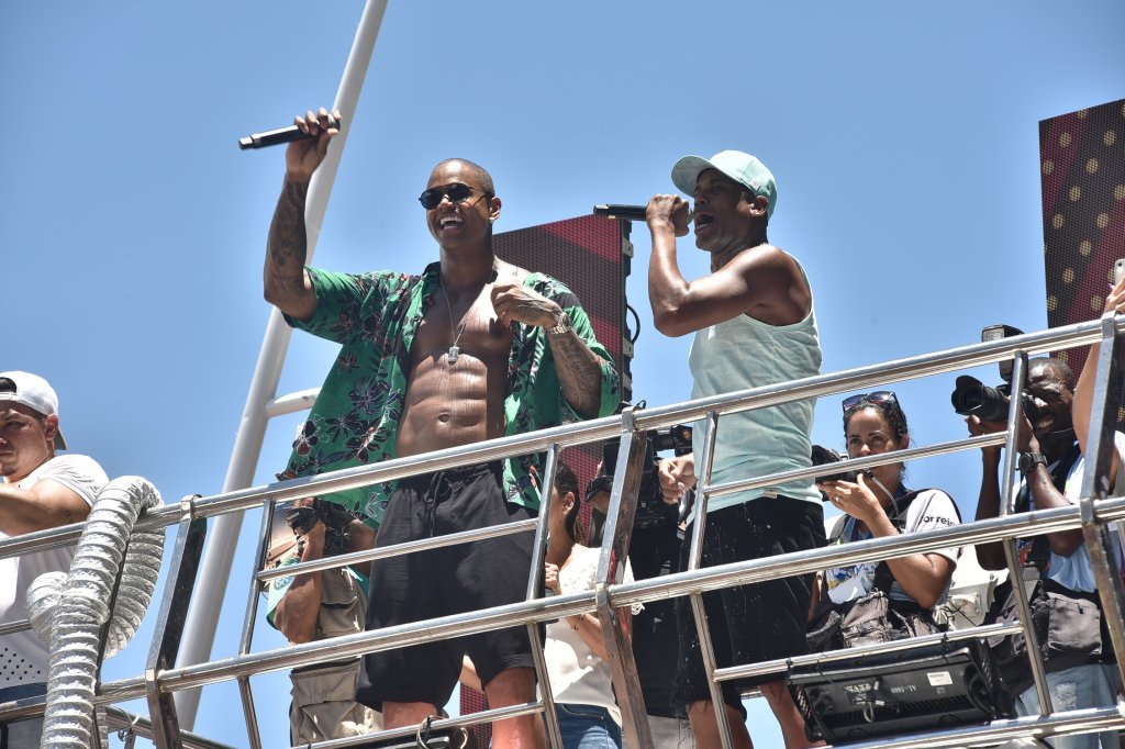 Léo Santana promoveu outro encontro no Arrastão da quarta-feira de cinzas. O cantor Flavinho da banda Pagodart subiu no trio na Barra.
