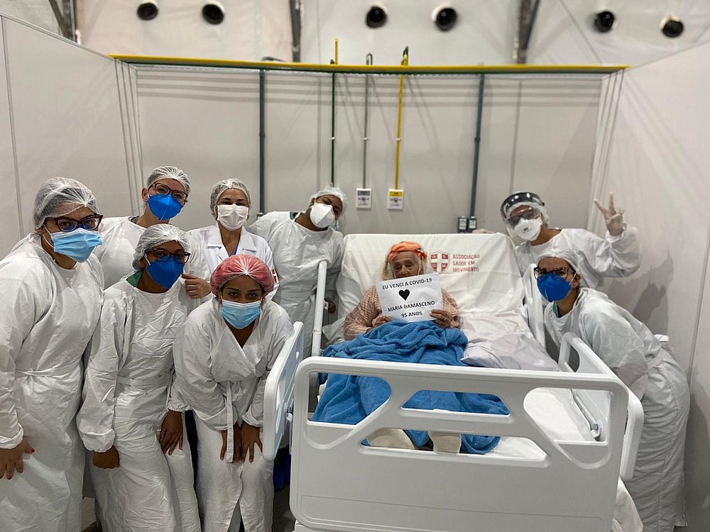 Magrinha, de aparência frágil, e cabelos bem alvinhos, dona Maria Damasceno, 95 anos, é hipertensa e diabética. Ela foi hospitalizada no dia 6 de junho no Hospital de Campanha montado no Wet´n wild com os sintomas da covid-19. A idade avançada e o histórico de saúde não eram nada animadores, mas a idosa se mostrou mais forte do que a doença. Depois de quase 20 dias na unidade de internação, ela teve alta na quinta-feira (25).