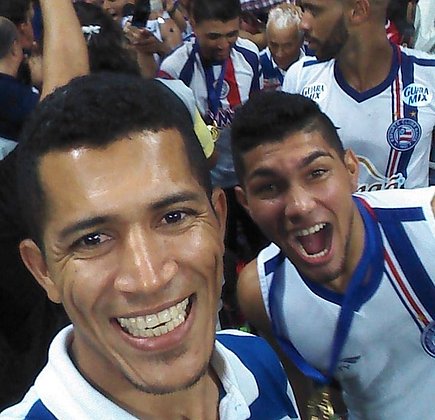 | Jeciel ao lado do meio campo Yuri na comemoração do título Baiano de 2015 do Bahia |